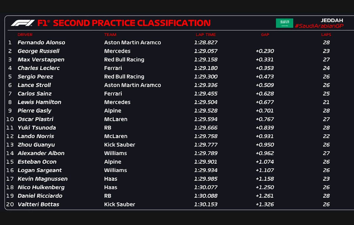 Ο Φερνάντο Αλόνσο έγινε ο πρώτος οδηγός που κατέβασε τον ταχύτερο γύρο κάτω από το 1:29 στο σιρκουί της Τζέντα, κατά τη δεύτερη περίοδο των ελεύθερων δοκιμών του GP Σαουδικής Αραβίας, αφήνοντας δυόμισι δέκατα πίσω του τον Τζορτζ Ράσελ και τριάμισι τον Μαξ Φερστάπεν.