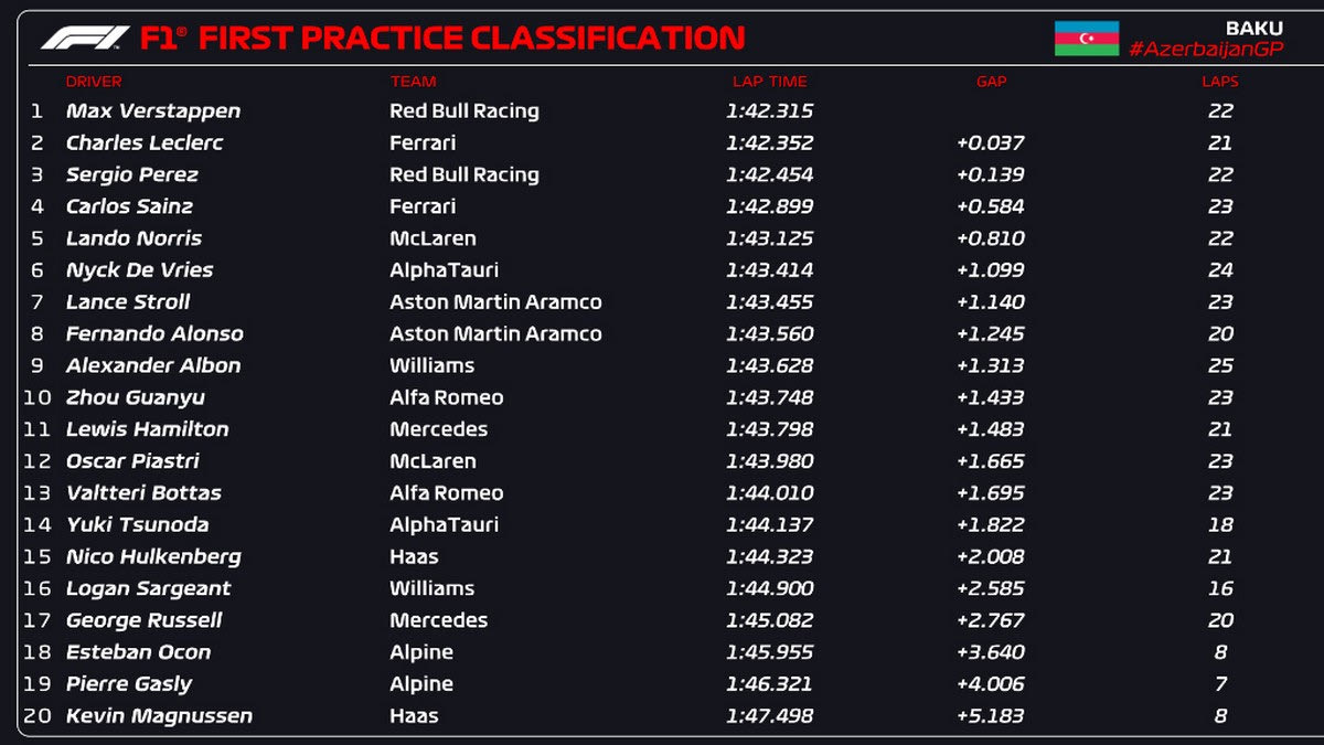 Με έναν γρήγορο γύρο στο τέλος ο Μαξ Φερστάπεν σημείωσε τον πρώτο χρόνο στις εναρκτήριες ελεύθερες δοκιμές του GP Αζερμπαϊτζάν, με οριακή διαφορά από τον Σαρλ Λεκλέρ της Ferrari που δείχνει αναγεννημένη. Διακοπή το πρώτο ημίωρο λόγω φωτιάς της Alpine του Πιέρ Γκασλί.