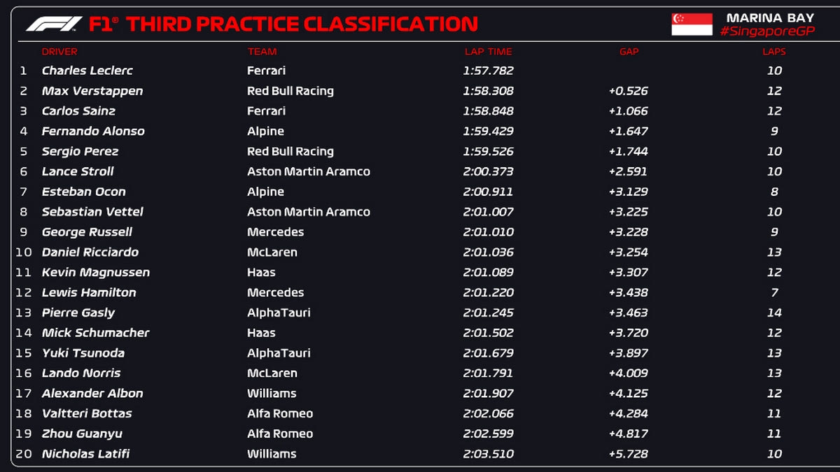 Ο Σέρτζιο Πέρεζ έμεινε 1,75” μακριά από τον Λεκλέρ, έχοντας διακόψει πρόωρα τον τελευταίο του γρήγορο γύρο, ενώ οι δύο Mercedes ήταν με τον Τζορτζ Ράσελ (9ος) και Λιούις Χάμιλτον (12ος) πάνω από τρία δευτερόλεπτα μακριά. Ο τελευταίος βγήκε στην πίστα για μόλις επτά γύρους – σε μια περίοδο δοκιμών που, παρά τις συνθήκες, δεν επεφύλασσε κανένα ιδιαίτερο απρόοπτο.