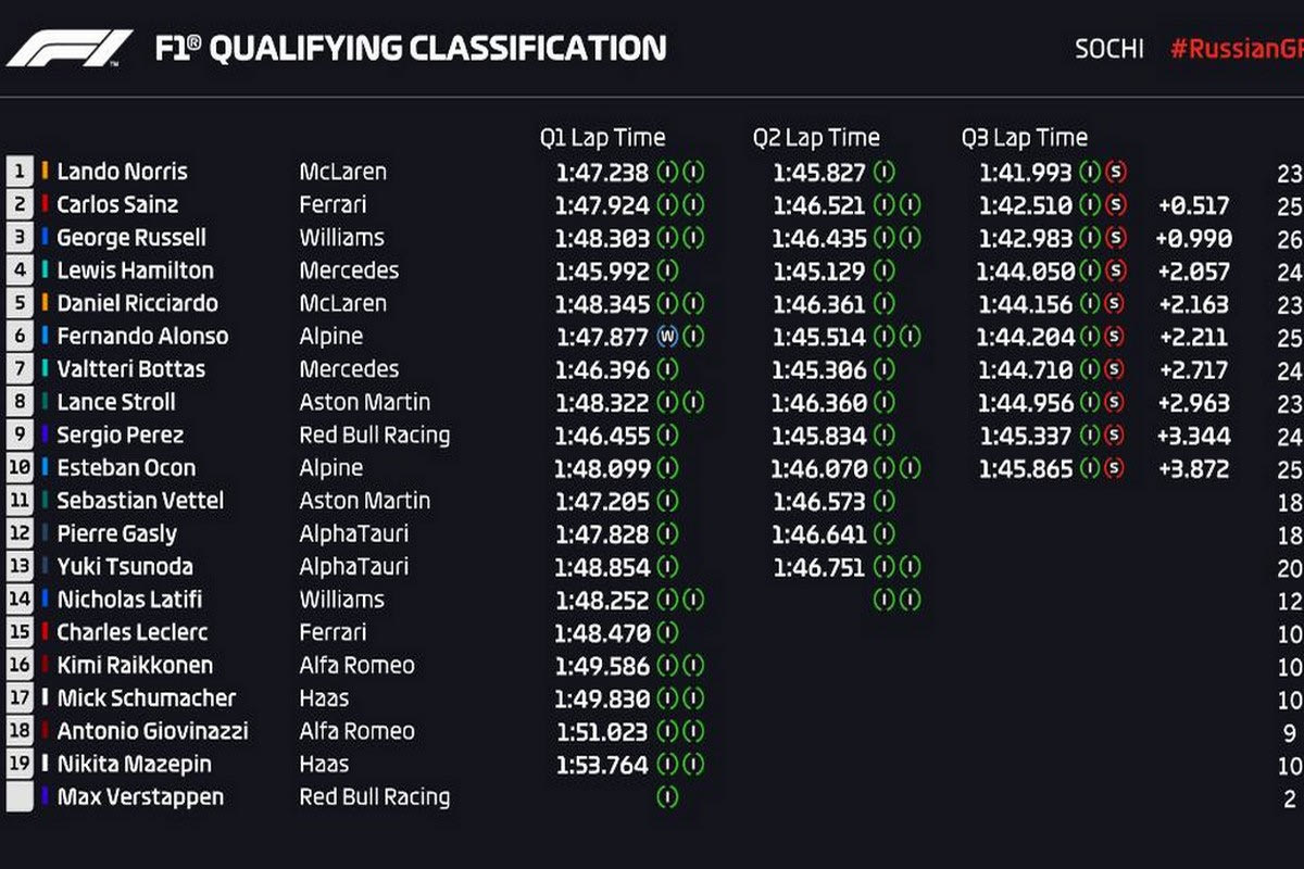 Σαν ένα όνειρο για τη McLaren που συνεχίζεται, μετά τη νίκη στη Μόντσα, ο Λάντο Νόρις κέρδισε την πρώτη πολ ποζίσιον της καριέρας του GP Ρωσίας μπροστά από τον Κάρλος Σάινθ της Ferrari, που εκμεταλλεύτηακν τις βροχερές και εναλλασσόμενες συνθήκες στο Σότσι. Τέταρτος, έπειτα από δύο μικρά ατυχήματα, ο Λιούις Χάμιλτον.