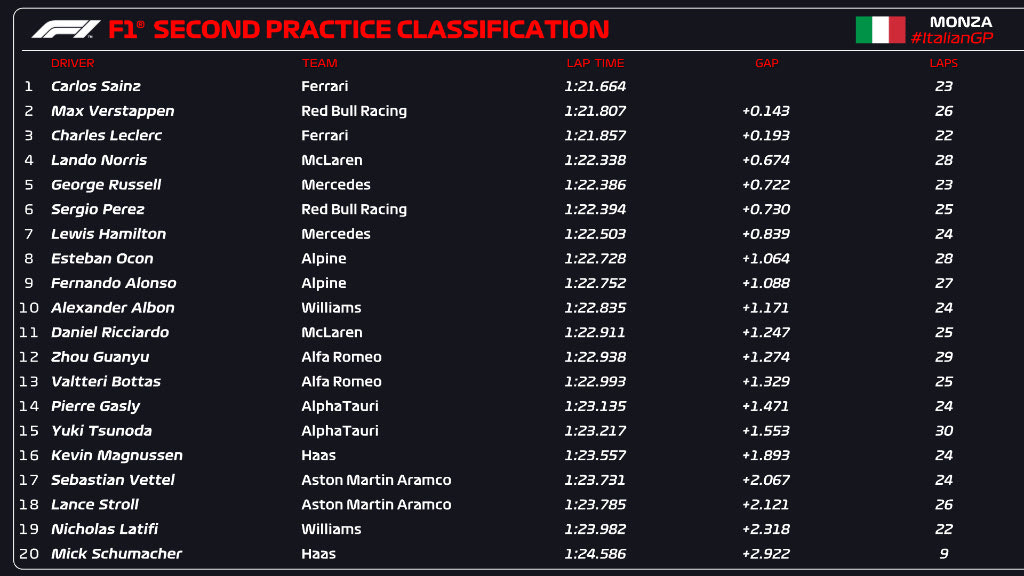 Με έναν υπέροχο γύρο ο Κάρλος Σάινθ άφησε πίσω του ενάμισι δέκατο τον Μαξ Φερστάπεν και δύο δέκατα τον Σαρλ Λεκλέρ στη δεύτερη περίοδο των ελεύθερων δοκιμών του GP Ιταλίας.
