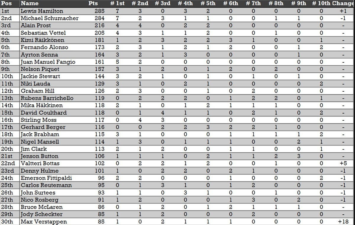 Από αυτόν τον υπολογισμό προέκυψε ένα σημαντικό στοιχείο, καθώς με την δεύτερη θέση του ο Λούις Χάμιλτον πήρε 18 πόντους και προσπέρασε τον Μίκαελ Σουμάχερ στην All-Time κατάταξη. 285 πόντους έχει ο επτά φορές παγκόσμιος πρωταθλητής Βρετανός, 284 έχει ο επίσης επτά φορές παγκόσμιος πρωταθλητής Γερμανός, με τον Αλέν Προστ (216), τον Σεμπάστιαν Φέτελ (205) και τον Κίμι Ράικονεν (181) να συμπληρώνουν την πρώτη πεντάδα.