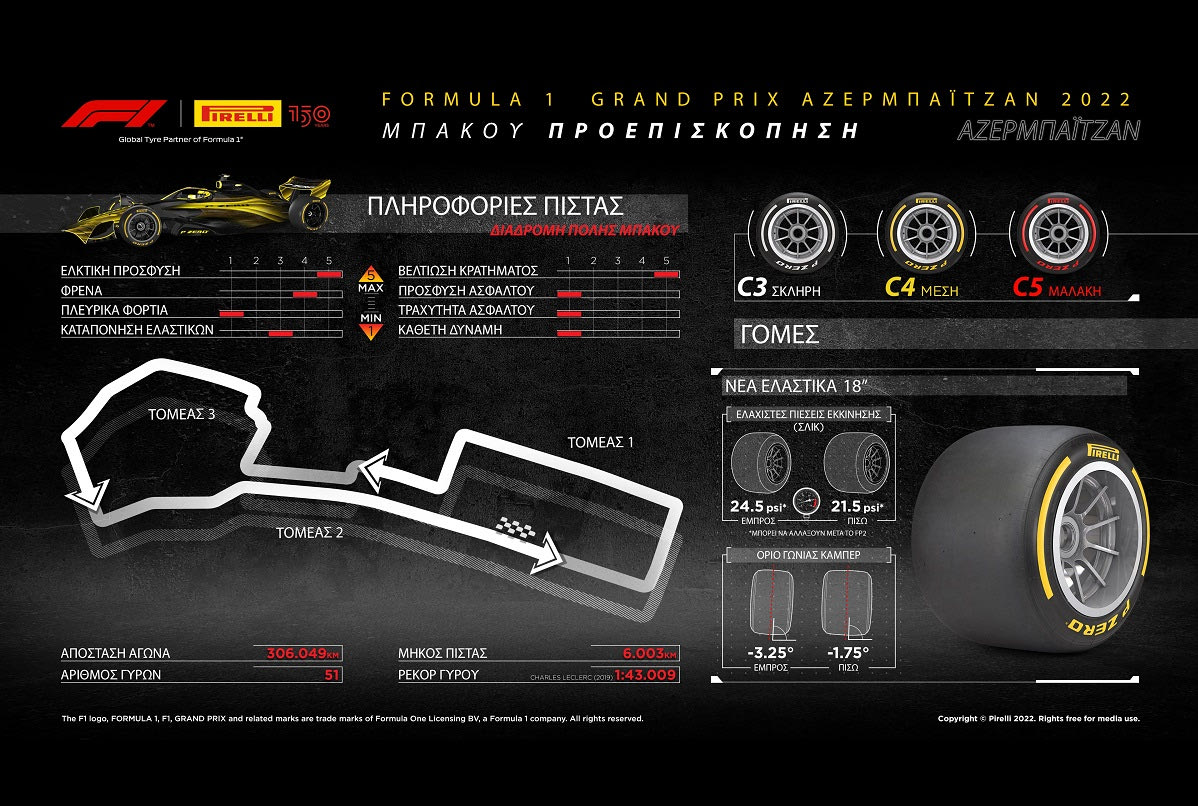 - Για το Μπακού, που συνδυάζει την πολυπλοκότητα του Μονακό με τις ταχύτητες της Μόντσα, η Pirelli επέλεξε τις πιο μαλακές γόμες στη γκάμα της: η C3 είναι η P Zero λευκή/σκληρή, η C4 είναι η P Zero κίτρινη/μέση, και η C5 είναι η P Zero κόκκινη/μαλακή. Είναι η ίδια επιλογή με πέρυσι για το Αζερμπαϊτζάν, μολονότι οι γόμες και οι σκελετοί είναι τελείως διαφορετικοί το 2022.