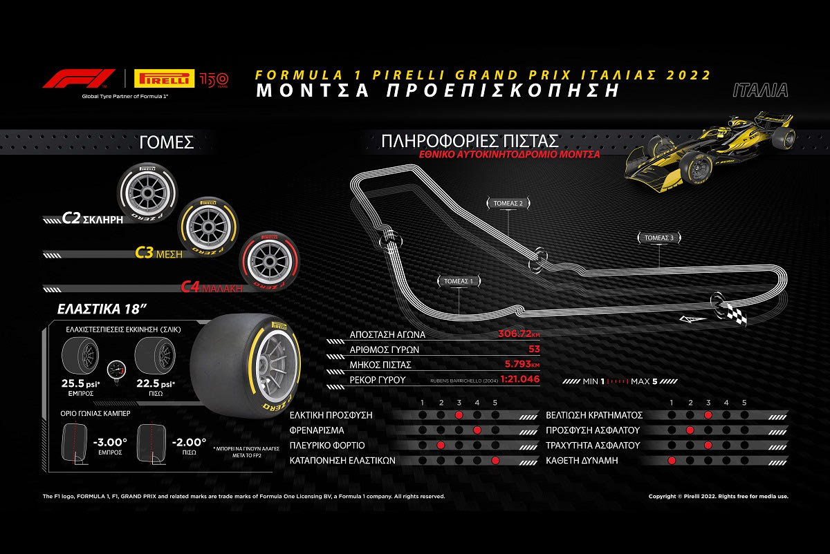 - Τα τρία ελαστικά από το μέσο της γκάμας μας επέλεξε η Pielli για το ιταλικό GP και την πίστα της Μόντσα είναι η C2 ως P Zero λευκή/σκληρή γόμα, η C3 ως P Zero κίτρινη/μέση γόμα και η C4 ως P Zero κόκκινη/μαλακή γόμα.