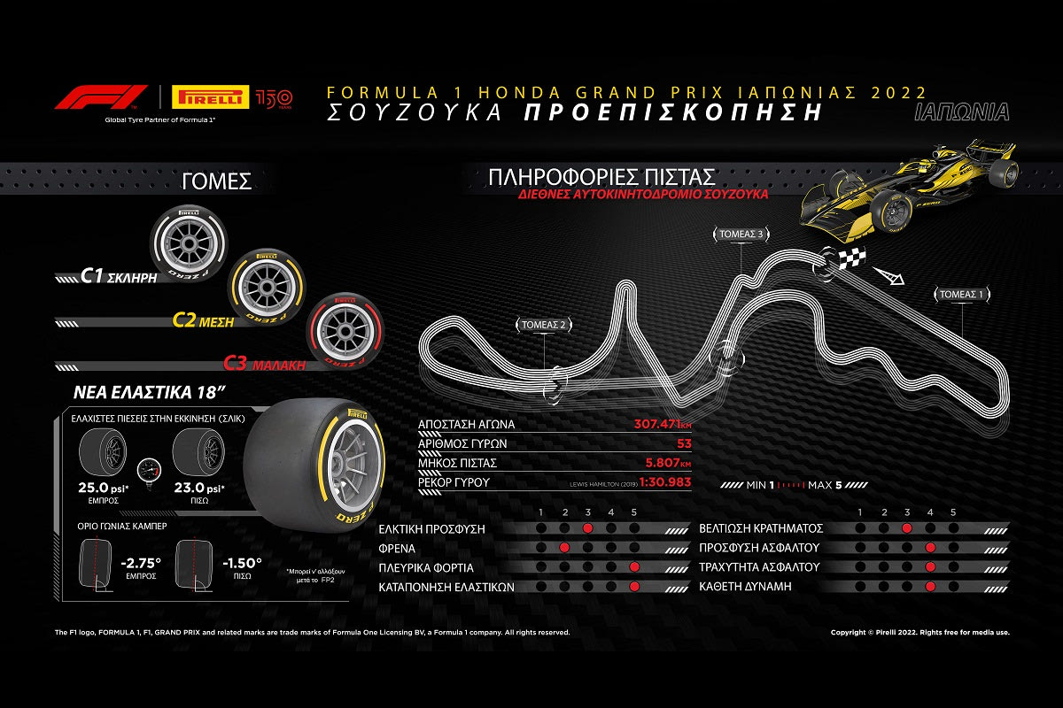 - Η χάραξη της πίστας υποχρέωσε την Pirelli να επιλέξει τις τρεις πιο σκληρές γόμες της γκάμας, καθώς τα ελαστικά εδώ δέχονται μεγάλη πίεση. Έτσι, οι τρεις γόμες για τη Σουζούκα είναι: η C1 θα είναι η P Zero λευκή/σκληρή, η C2 θα είναι η P Zero κίτρινη/μέση και η C3 θα είναι η P Zero κόκκινη/μαλακή. Αυτή θα είναι και η τελευταία εμφάνιση της πιο σκληρής γόμας C1 φέτος.