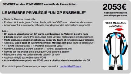 Φυσικά, όποιος δώσει 2.053 ευρώ θα έχει και τα… τυχερά του. Όπως είναι δύο εισιτήρια για έναν “ευρωπαϊκό” αγώνα, άδεια για να… τριγυρίσει στο πάντοκ και να ξεναγηθεί από τον Ντεμπίς, αλλά και πληρωμένη συνδρομή ενός χρόνου στην ιστοσελίδα του MotoGP για να διαβάζει τα νέα και να παρακολουθεί τους αγώνες!