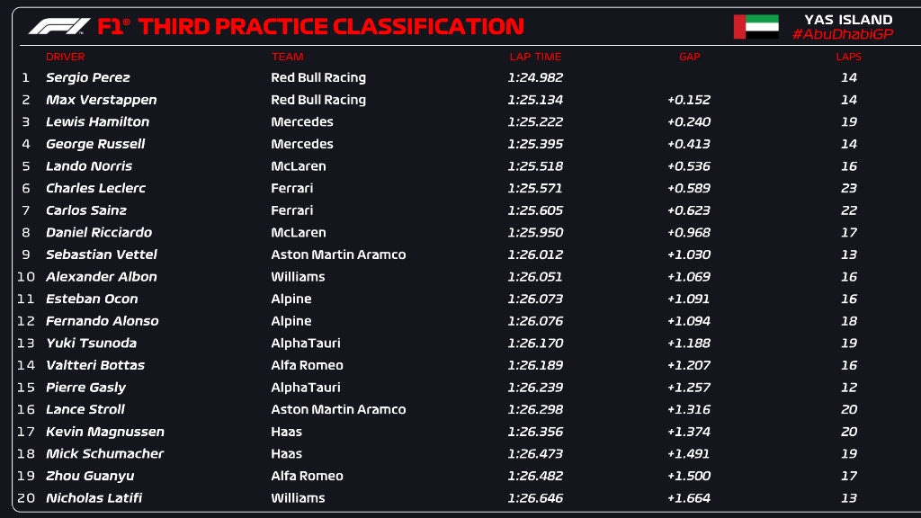 Ο Σέρτζιο Πέρεζ ηγήθηκε του Μαξ Φερστάπεν στο 1-2 της Red Bull στην τρίτη περίοδο ελεύθερων δοκιμών στη Γιάς Μαρίνα. Ο Λιούις Χάμιλτον ήταν στο ένα δέκατο πίσω τους, αλλά απειλείται με ποινή λόγω προσπέρασης υπό καθεστώς κόκκινης σημαίας.