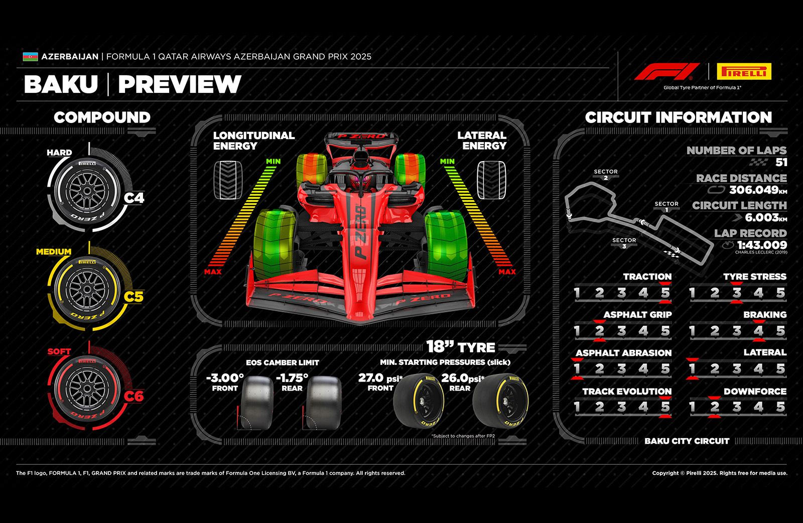 Η Pirelli έχει φέρει στο Μπακού τις τρεις πιο μαλακές γόμες της γκάμας της, συμπεριλαμβανομένης της μαλακότερης φετινής C6 που δοκιμάστηκε ήδη στην Ίμολα, στο Μονακό και στον Καναδά. Η μέση γόμα, κατά συνέπεια, είναι η C5 και η σκληρή η C4.