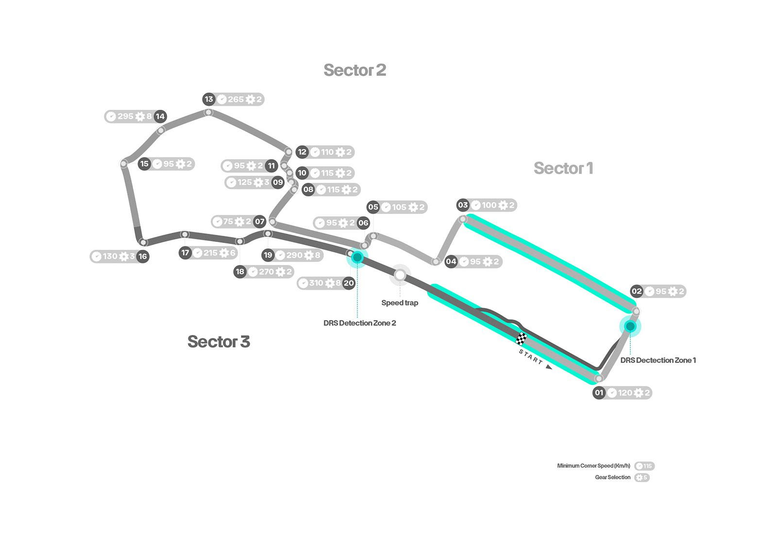 - Στα 6 χιλιόμετρα του σιρκουί, παρά τις 20 στροφές του, η τεράστια ευθεία του (μήκους 2 km) θεωρείται η “Μέκκα” του slipstreaming – με ταχύτητες που μπορεί να ξεπερνούν τα 350 km/h, πριν φτάσει στην πολύ φαρδιά “Στροφή 1” των 90 μοιρών που ακολουθεί, προσφέροντας ευκαιρίες προσπέρασης.