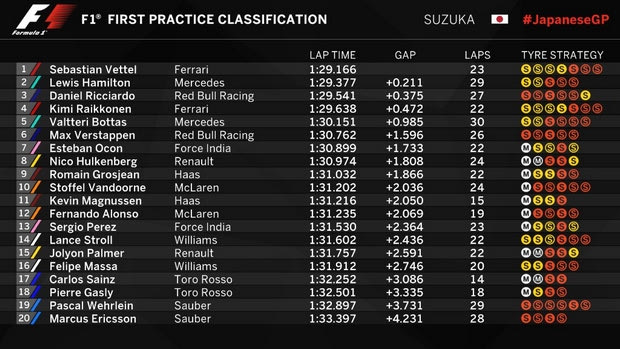 Σε μονομαχία Sebastian Vettel-Lewis Hamilton εξελίχθηκε η πρώτη περίοδος ελεύθερων δοκιμών του ιαπωνικού Grand Prix που διεξάγεται στη θρυλική πίστα της Σουζούκα και αποτελεί τον δέκατο-έκτο γύρο του φετινού παγκοσμίου πρωταθλήματος. Ο Γερμανός επικράτησε του Βρετανού με διαφορά δύο δεκάτων, σε μία διαδικασία που διεκόπη λόγω ατυχήματος του Carlos Sainz.