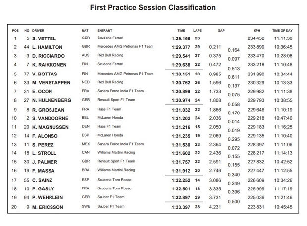 Ο πρώτος οδηγός που έγραψε χρόνο ήταν ο Sergio Perez με τη Force India, τον οποίο ακολούθησε ο teammate του, Esteban Ocon, με τον Lewis Hamilton να τους «προσπερνά» στην κατάταξη. Ο Βρετανός ήταν ο μόνος εκ των κορυφαίων συνδυασμών που τόλμησε να κάνει γρήγορο γύρο, ενώ στην κατάταξη τοποθέτησαν εαυτούς και οι δύο πιλότοι της Williams.