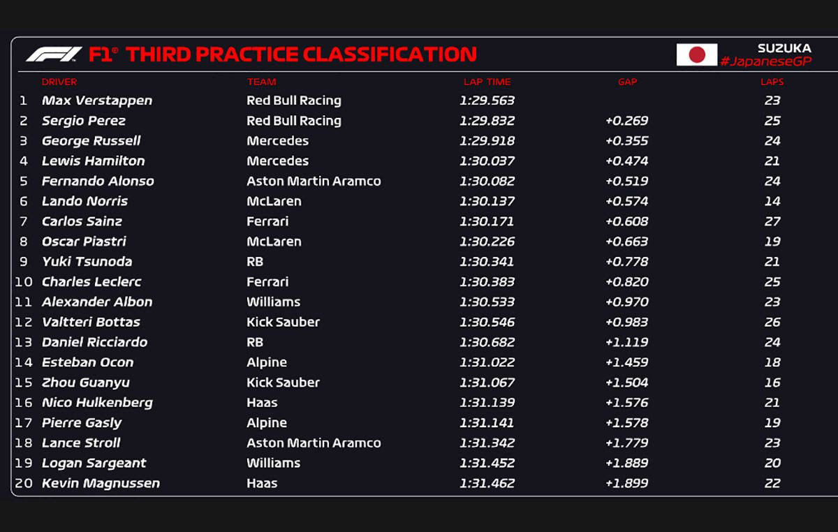 Ο Μαξ Φερστάπεν σημείωσε τον πρώτο χρόνο της τρίτης περιόδου ελεύθερων δοκιμών στη Σουζούκα με δυόμισι δέκατα διαφορά από τον Σέρτζιο Πέρεζ, ενώ πίσω από τους δύο οδηγούς της Red Bull οι Τζορτζ Ράσελ και Λιούις Χάμιλτον επιβεβαίωσαν τη βελτίωση της Mercedes W15.