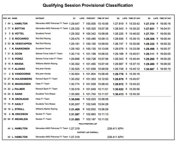 Αυτή ήταν η 71η στην καριέρα του και ήρθε σε συνδυασμό επίτευξης νέου ρεκόρ πίστας καθώς διέλυσε το προηγούμενο που ανήκε στον Michael Schumacher. Ο Valtteri Bottas τον πλαισίωσε στο 1-2 των ασημί βελών αλλά λόγω ποινής για αλλαγή κιβωτίου, θα παραχωρήσει τη θέση του στην πρώτη σειρά του grid στον μεγάλο αντίπαλο του Hamilton στη μάχη του τίτλου, τον Sebastian Vettel.