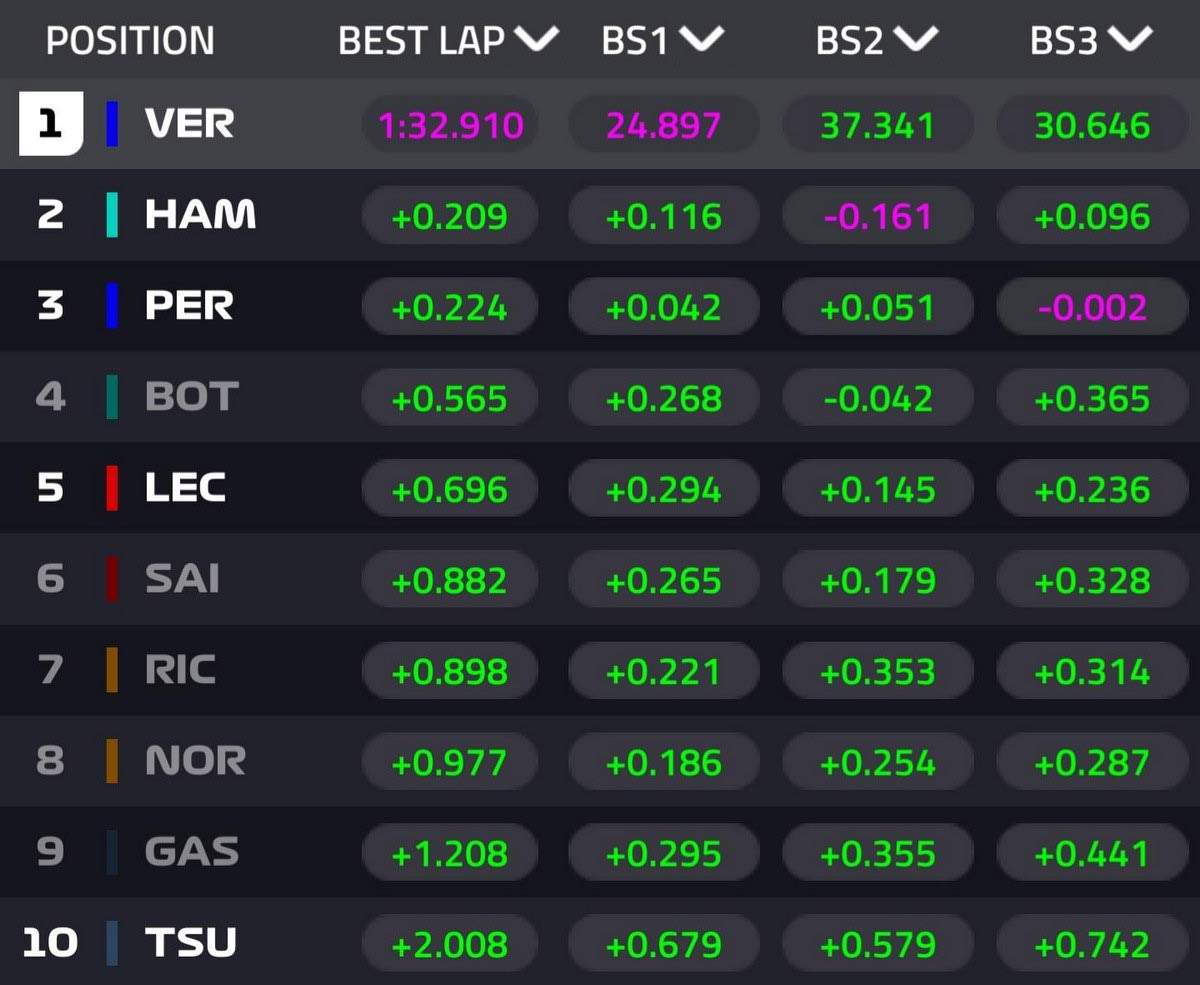 Οι McLaren και Ferrari απείλησαν αρχικά, στο Q1 και Q2, τις δύο κορυφαίες ομάδες – αλλά τελικά έμειναν στα 7 ως 9 δέκατα μακριά από τον Φερστάπεν. Η Ferrari βγήκε νικήτρια της σημερινής μονομαχίας με τη McLaren, καθώς οι Σαρλ Λεκλέρ και Κάρλος Σάινθ έγραψαν τον 5ο και 6ο χρόνο, ενώ οι Ντάνιελ Ρικιάρντο και Λάντο Νόρις τον 7ο και 8ο. Και οι τέσσερις θα ανέβουν, πάντως, μία θέση στην εκκίνηση, λόγω της ποινής στον Μπότας.