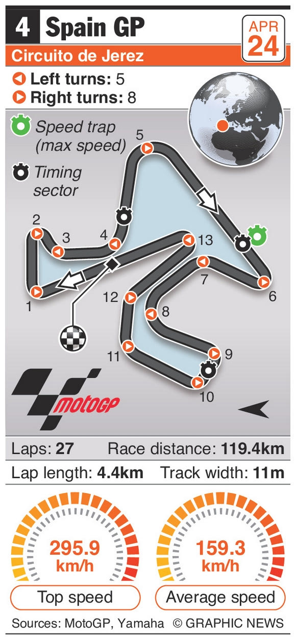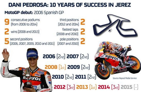 Ο Dani Pedrosa θα έχει δύσκολη αποστολή εκκινώντας από την έβδομη θέση, αλλά ο Ισπανός έχει παράδοση καλών αποτελεσμάτων στη Jerez όπου πίσω στο 2006 έκανε το ντεμπούτο του στη μεγάλη κατηγορία. Με εξαίρεση πέρσι που δεν αγωνίστηκε λόγω της επέμβασης που έκανε στο χέρι του για να αντιμετωπίσει το σύνδρομο arm-pump μετρά 9 συνεχόμενες παρουσίες στο βάθρο από το 2006 μέχρι και το 2014.