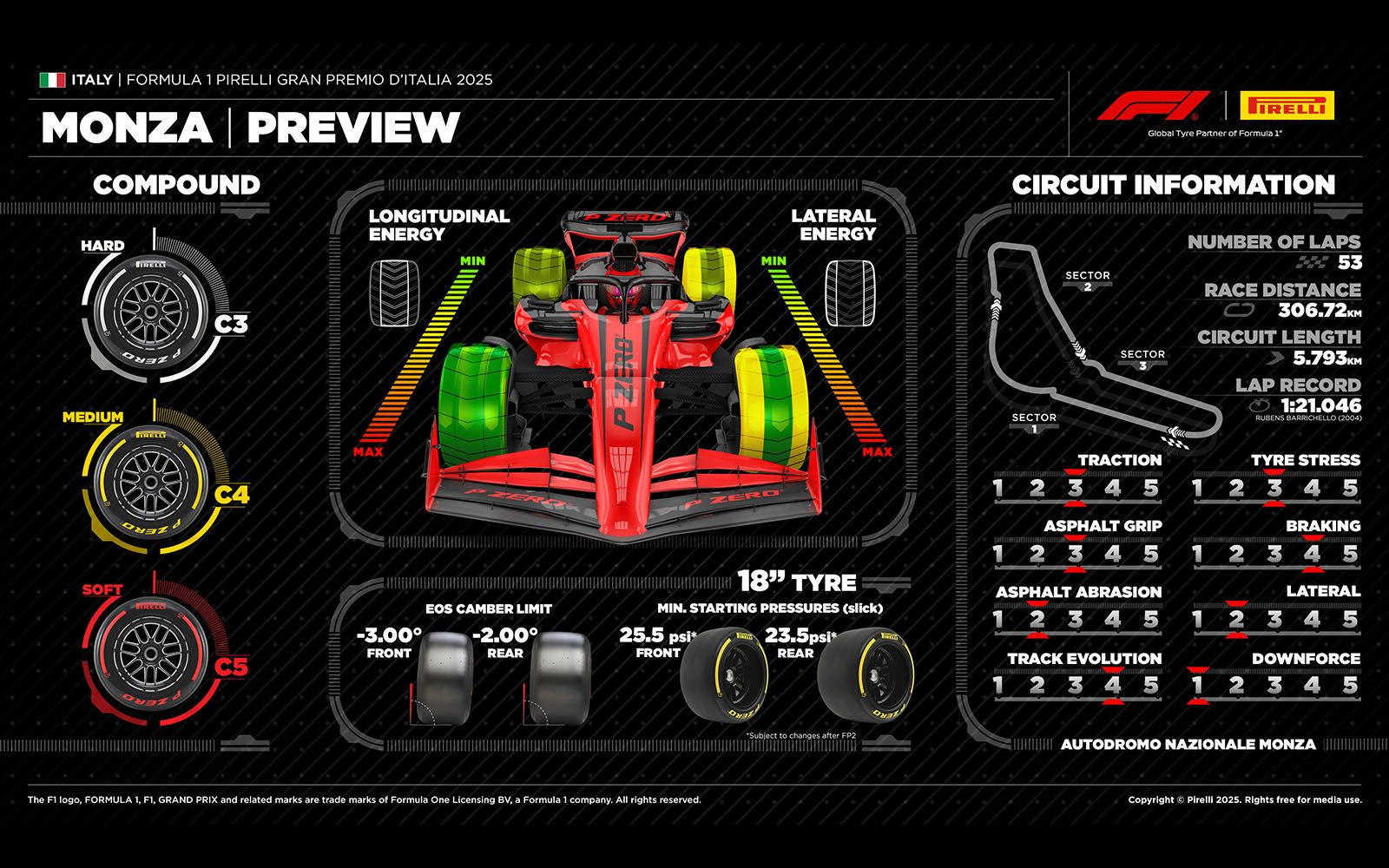 Αυτή τη φορά, σε αντίθεση με τα τελευταία GP, η Pirelli δεν επεφύλασσε καμία αλλαγή σε σχέση με πέρσι στους τρεις τύπους ελαστικών για τον αγώνα της Μόντσα. Πρόκειται για τις γόμες C3 (σκληρή), C4 (μέση) και C5 (μαλακή). Εξαιρουμένης της εξειδικευμένης C6, αυτοί είναι οι τρεις πιο μαλακοί τύποι ελαστικών της ιταλικής εταιρείας.