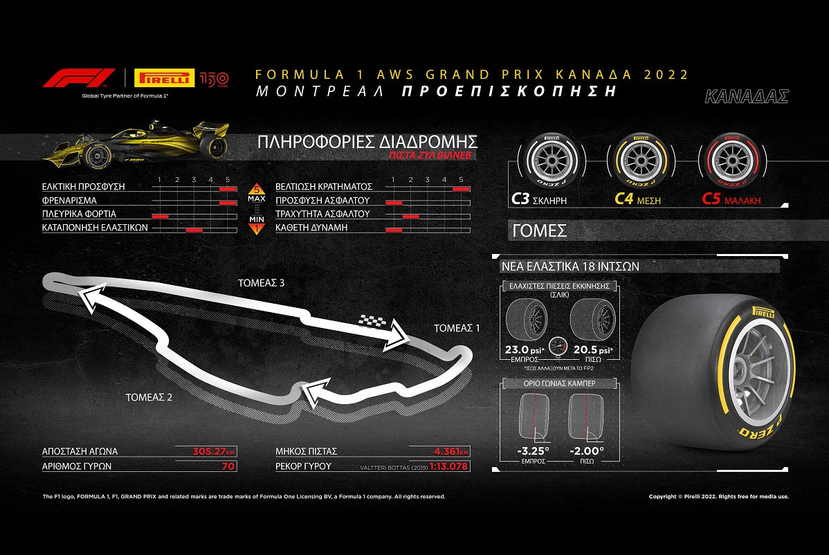 - Στον Καναδά η Pirelli φέρνει ξανά τις πιο μαλακές γόμες της γκάμας, ίδια επιλογή μ’ αυτή που είχε γίνει στο Μόντρεαλ το 2019, αλλά και στους δυο τελευταίους αγώνες σε Μονακό και Αζερμπαϊτζάν. Η C3 είναι η P Zero λευκή /σκληρή γόμα, η C4 είναι η P Zero κίτρινη/μέση γόμα και η C5 είναι η P Zero κόκκινη/μαλακή γόμα. Το 2019 η στρατηγική του νικητή ήταν αυτή της μιας αλλαγής: εκκίνησε με τη μέση γόμα και τερμάτισε με τη σκληρή.