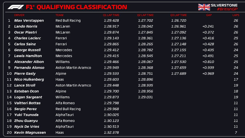 Για μία ακόμα ο Μαξ Φερστάπεν και η Red Bull θα εκκινήσουν από την pole position σε ένα Grand Prix. Αυτή τη φορά ο Παγκόσμιος πρωταθλητής σταμάτησε το χρονόμετρο στο 1:26.720 στις κατατακτήριες του GP Μεγάλης Βρετανίας.