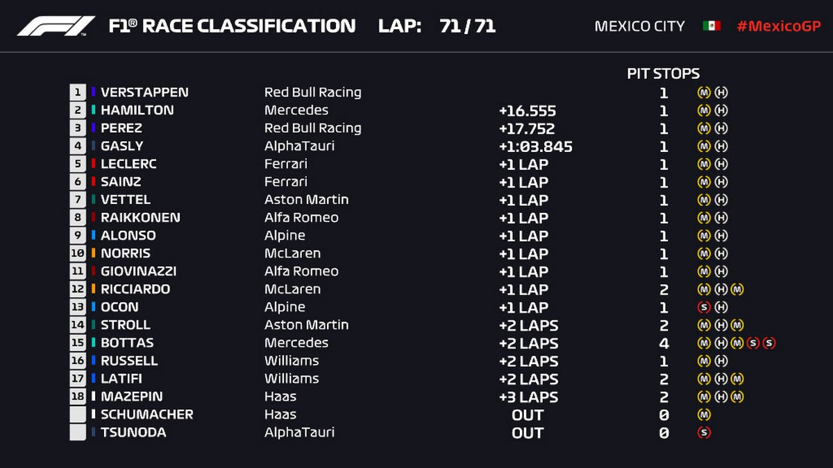 Ο Μαξ Φερστάπεν κυριάρχησε ολοκληρωτικά στην πίστα Χερμάνος Ροντρίγκεζ, από την πρώτη στροφή -που πέρασε τον Χάμιλτον- και μέχρι την καρό σημαία. Στους 19 βαθμούς αυξήθηκε η διαφορά των δύο στο πρωτάθλημα, τέσσερις αγώνες πριν το φινάλε της σεζόν.