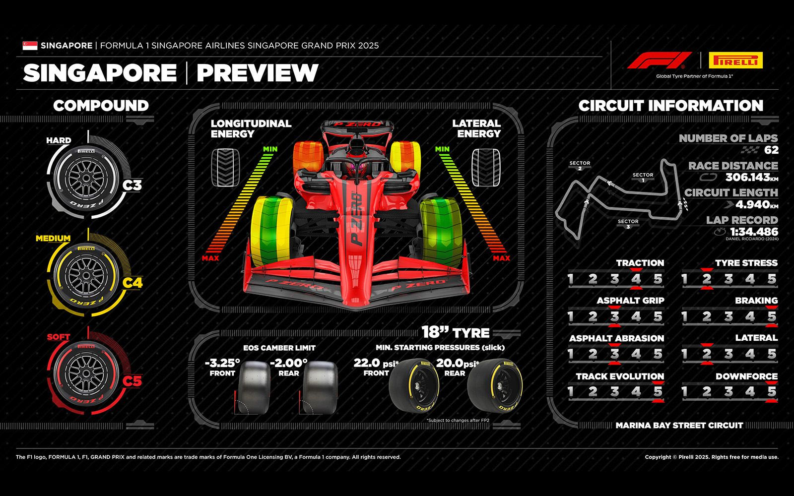 Οι τρεις τύποι ελαστικών για τον αγώνα της Σιγκαπούρης έμειναν απαράλλαχτοι από πέρσι: η σκληρή είναι η C3, η μέση η C4 και η μαλακή η C5. Ωστόσο, και εδώ η F1 αύξησε το όριο ταχύτητας στα πιτς από τα 60 στα 80 km/h, μήπως ενθαρρύνει εναλλακτικές στρατηγικές.