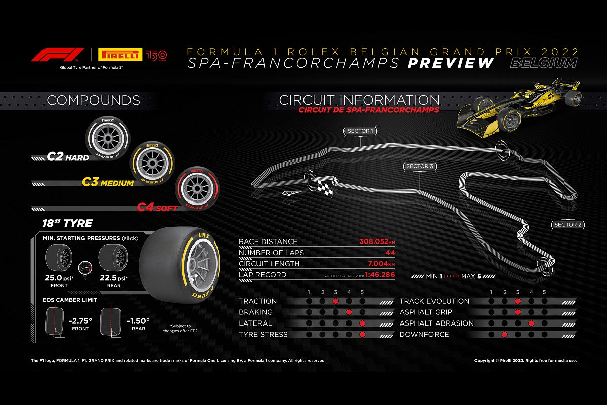 - Το Σπα είναι από τις πιο απαιτητικές πίστες για τα ελαστικά. Στην Eau Rouge για παράδειγμα, πιέζονται αφόρητα στην άσφαλτο από την κάθετη δύναμη λόγω υψηλής ταχύτητας, ενώ την ίδια στιγμή πρέπει να προσφέρουν πρόσφυση, πρώτα για την αριστερή και ύστερα για τη δεξιά στροφή. Η Pirelli έχει επιλέξει τις γόμες C2 ως P Zero σκληρή (λευκή), C3 ως P Zero μεσαία (κίτρινη) και C4 ως P Zero μαλακή (κόκκινη). Η πιθανότητα βροχής καθιστά πιθανή την εμφάνιση τόσο της ενδιάμεσης γόμας (Cinturato πράσινη) όσο και της βρόχινης (Cinturato μπλε).