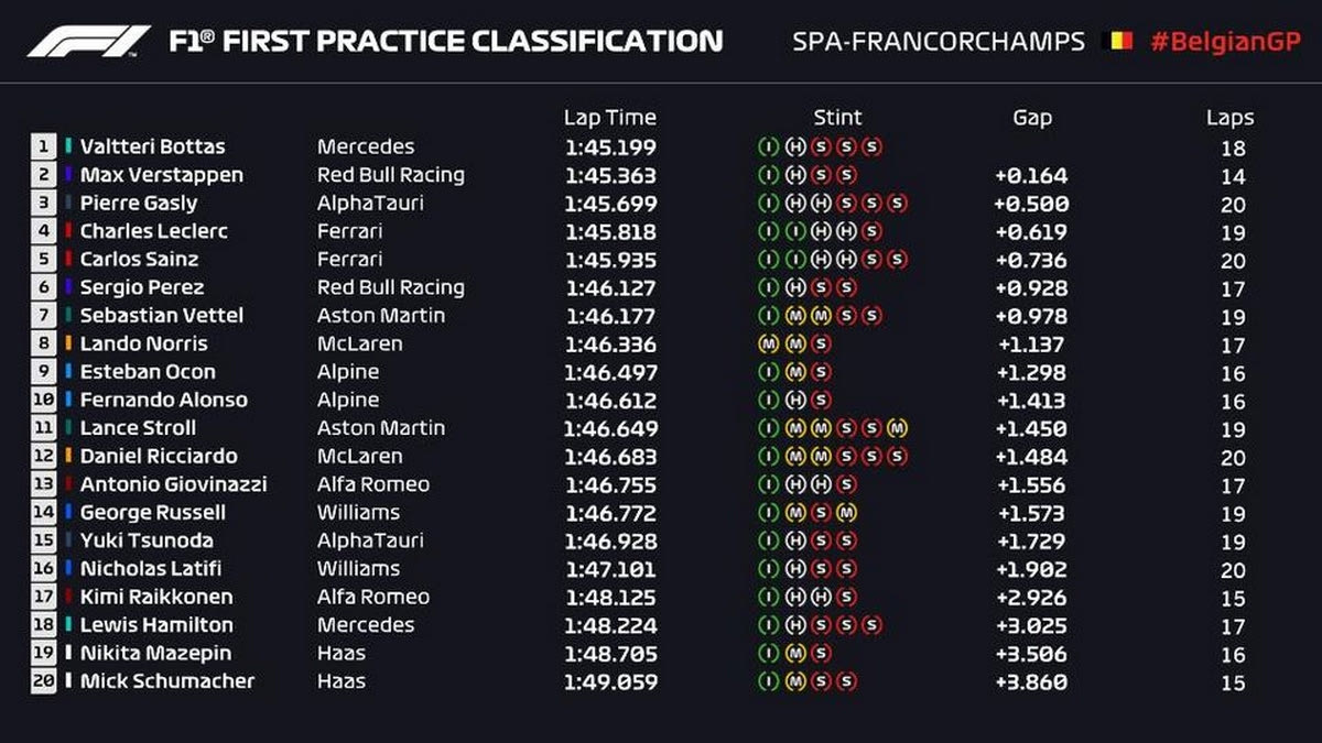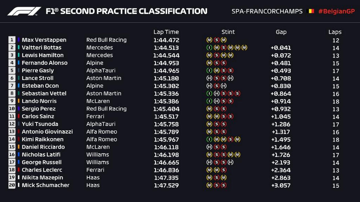 Στην επιστροφή της Formula 1 μετά το καλοκαιρινό διάλειμμα, για τον 12ο φετινό της αγώνα και το δεύτερο μισό της σεζόν, ο Ολλανδός της RBR-Honda σημείωσε τον ταχύτερό του γύρο με τη μαλακή γόμα ενώ οι δύο οδηγοί της Mercedes με τη μέση.