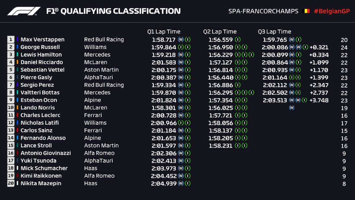 Στις κατατακτήριες δοκιμές του Βελγίου που σημαδεύτηκαν απ' το ατύχημα του Λάντο Νόρις, ο Μαξ Φερστάπεν πήρε την pole position, ενώ ο Ράσελ τερμάτισε πάνω απ' τον Χάμιλτον στη δεύτερη θέση.