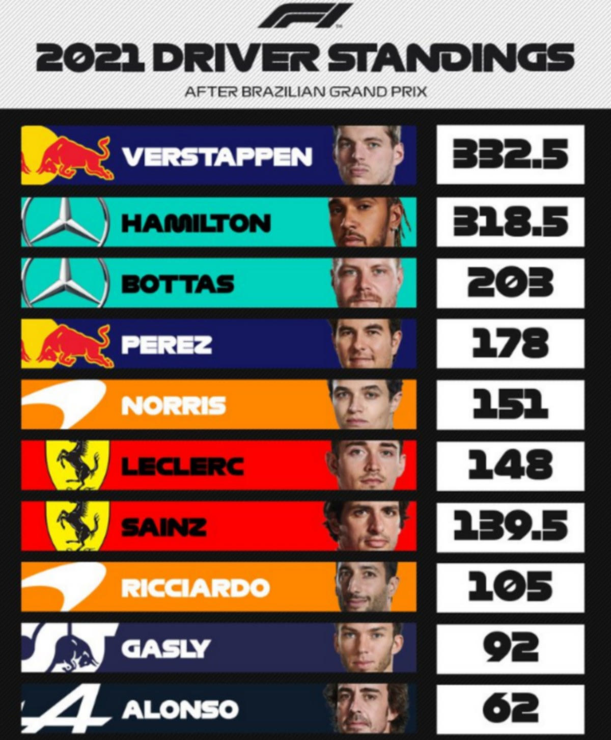 Ο Λιούις Χάμιλτον κέρδισε το GP Βραζιλίας παρότι εκκίνησε τελευταίος στον αγώνα Sprint Qualifying, όπου ανελίχθηκε στην 5η θέση, και παρότι εκκίνησε το Κυριακάτικο (14/11) GP από τη 10η θέση, λόγω αλλαγής του θερμικού κινητήρα της Mercedes την Παρασκευή.