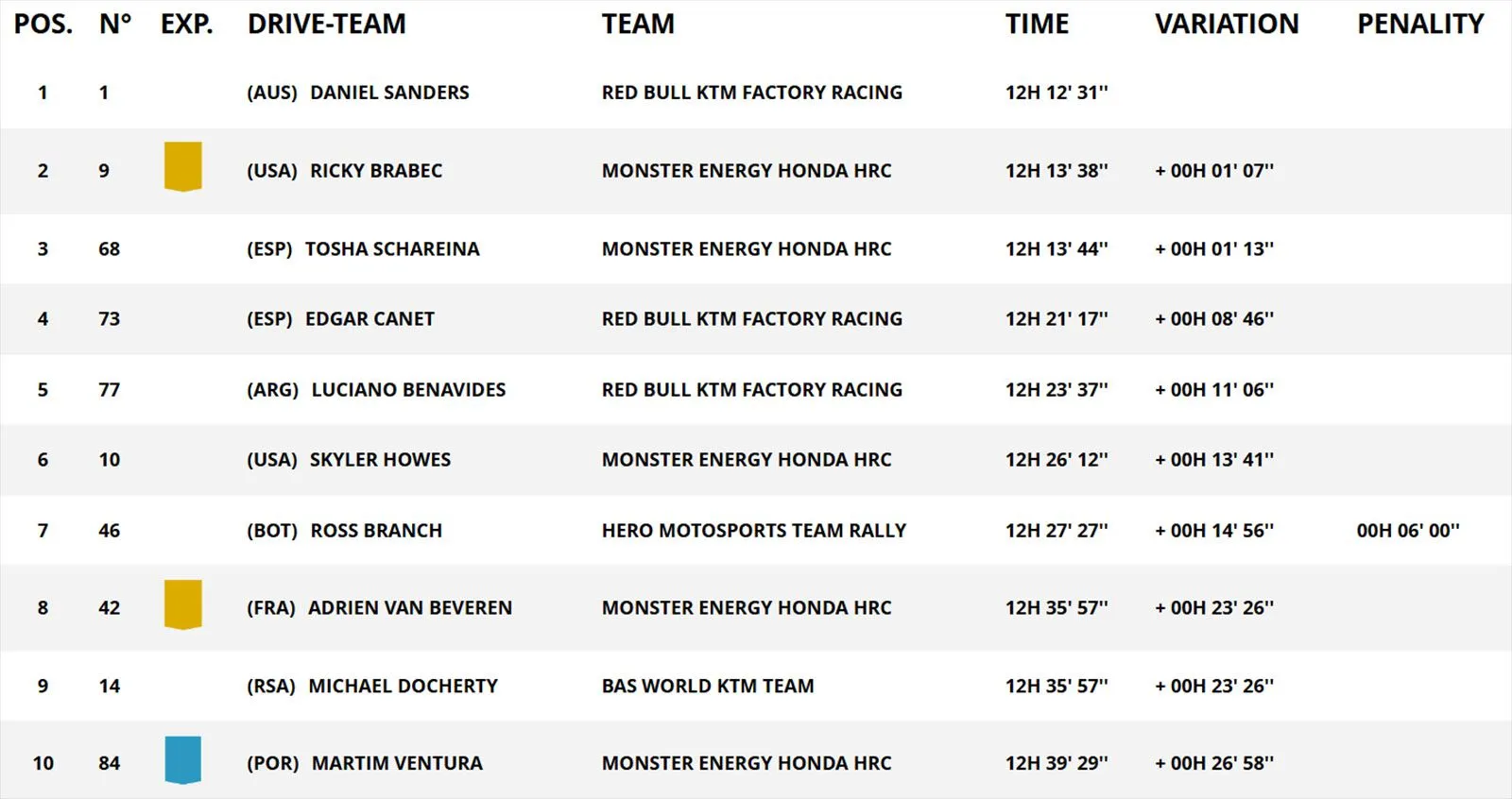 Ο Αυστραλός αναγκάστηκε να ανοίγει το δρόμο στο μεγαλύτερο μέρος των 421 χιλιομέτρων της Ειδικής, έχοντας ουσιαστικά παρέα μόνο τον Ρίκι Μπράμπεκ της Honda – ο οποίος επιβεβαιώνει ότι βρίσκεται σε εξαιρετική φόρμα στο ξεκίνημα του φετινού Ντακάρ. Ο Αμερικανός ανέβηκε στη 2η θέση της γενικής και καταδιώκει τον Σάντερς από απόσταση 1’07’’.