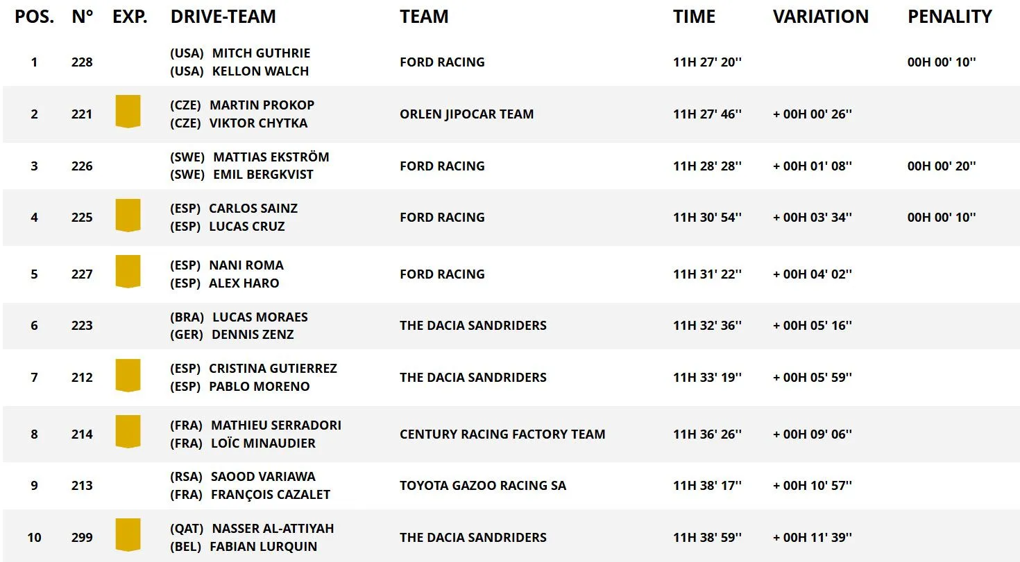 Μία μέρα μετά την κατάληψη της πρώτης πεντάδας της 2ης Ειδικής από ισάριθμα Toyota Hilux T1+, η μεγάλη σημερινή (6/01) ανατροπή έφερε πέντε Ford Ranger T1+ στην πρώτη πεντάδα της γενικής – με επικεφαλής τον Αμερικανό Μιτς Γκάθρι, που έγραψε τον πρώτο χρόνο στη διαδρομή των 421 χιλιομέτρων γύρω από την πόλη Αλ-Ούλα.