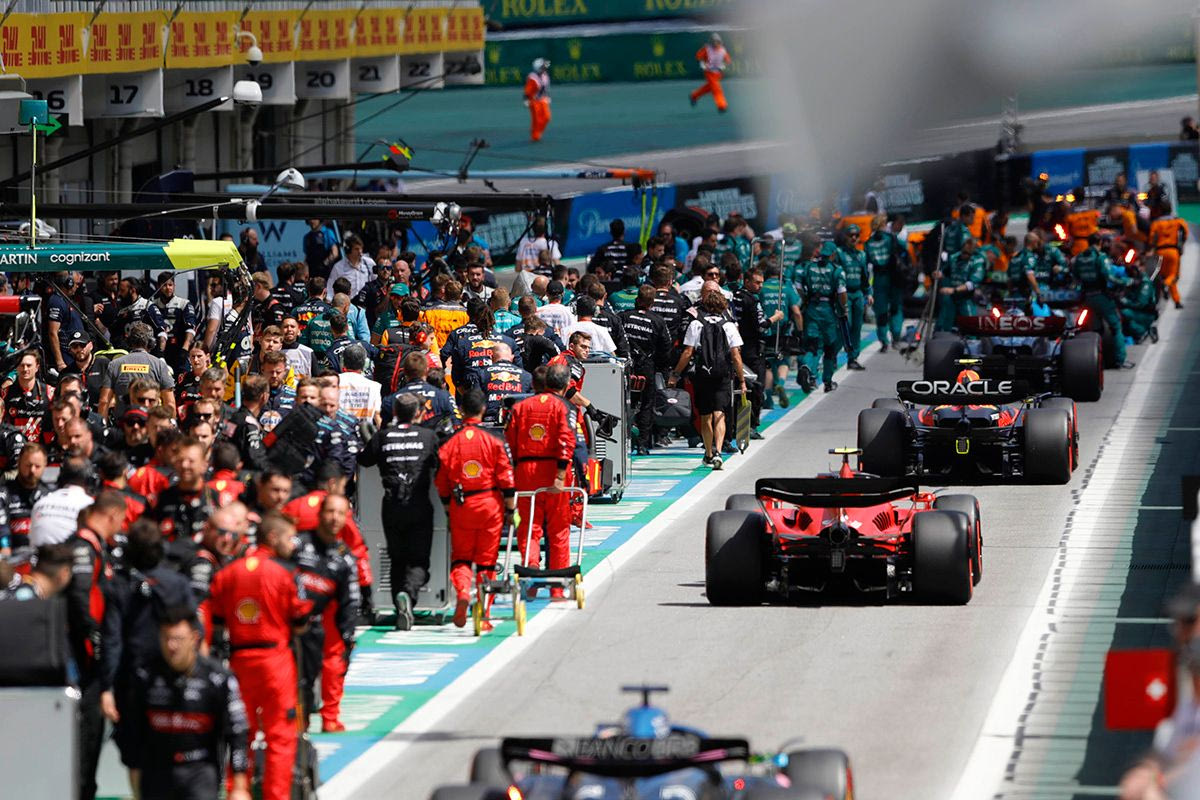 Drivers line up at pit lane after an aborted start due to collisions during the Brazilian Formula One Grand Prix at the Interlagos race track in Sao Paulo, Brazil, Sunday, Nov. 5, 2023. (AP Photo/Marcelo Chello, Pool) AP Photo/Marcelo Chello