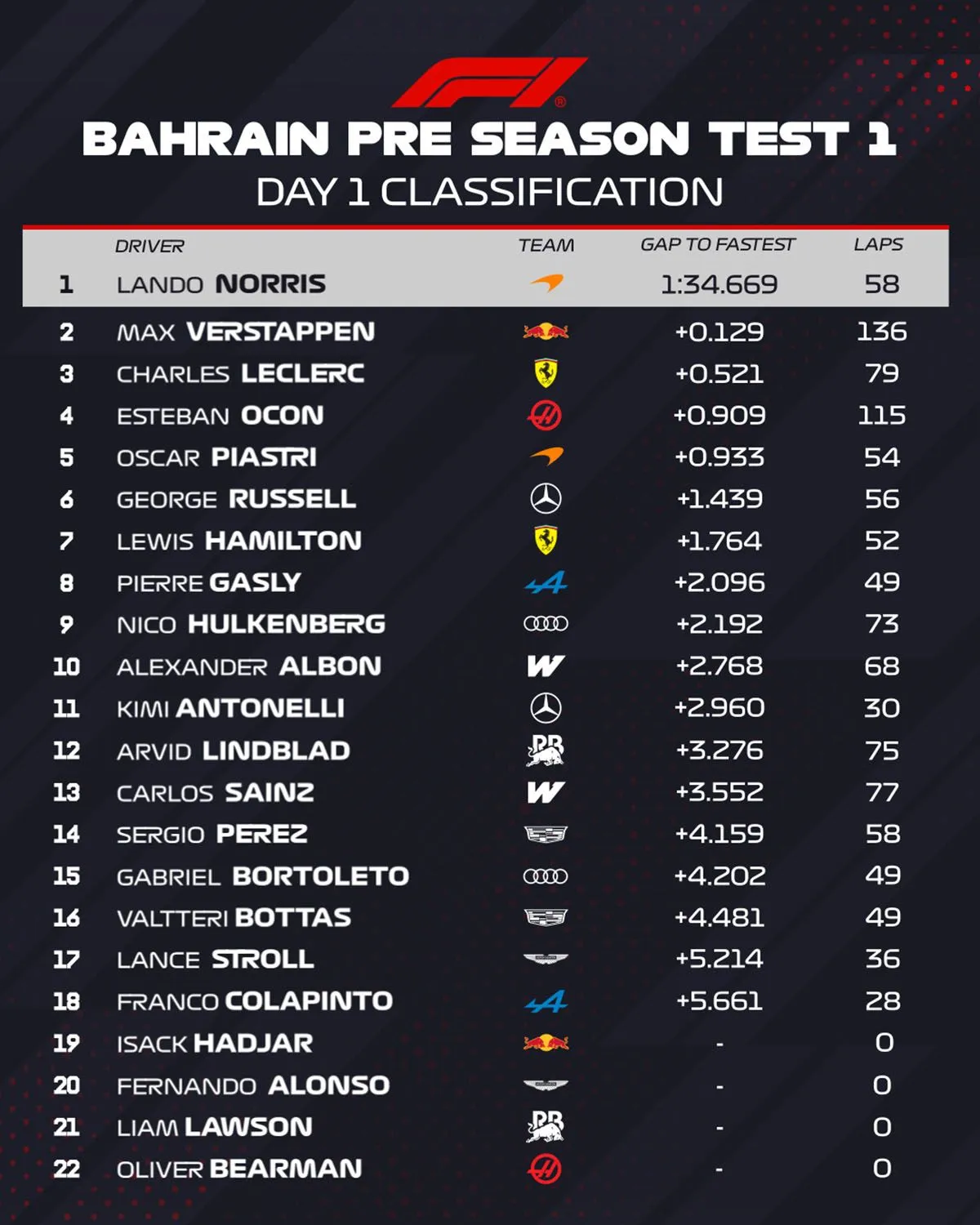 Ο Νόρις πέτυχε το χρόνο 1:34.669, που έμελλε να μείνει ως ο κορυφαίος της ημέρας, με τη μέση γόμα την προτελευταία ώρα της διαδικασίας. Ωστόσο, ακόμα πρέπει να διαβάζουμε τους χρόνους με επιφύλαξη, καθώς οι σημερινοί ήταν περίπου 4,0’’ πιο αργοί από τις αντίστοιχες περσινές δοκιμές και περίπου 6,0’’ πιο αργοί από την πολ ποζίσιον του GP του Μπαχρέιν 2025.