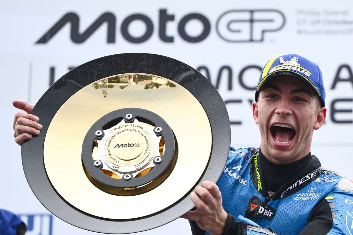 Ο Ισπανός αναβάτης της “δορυφορικής” Trackhouse Aprilia έζησε τη μαγεία της πρώτης του νίκης στη μεγάλη κατηγορία του MotoGP, με μια εντυπωσιακή εμφάνιση στο GP του Φίλιπ Άιλαντ. Στο βάθρο δίπλα του ο Φάμπιο ντι Τζιαναντόνιο και ο Μάρκο Μπετζέκι.