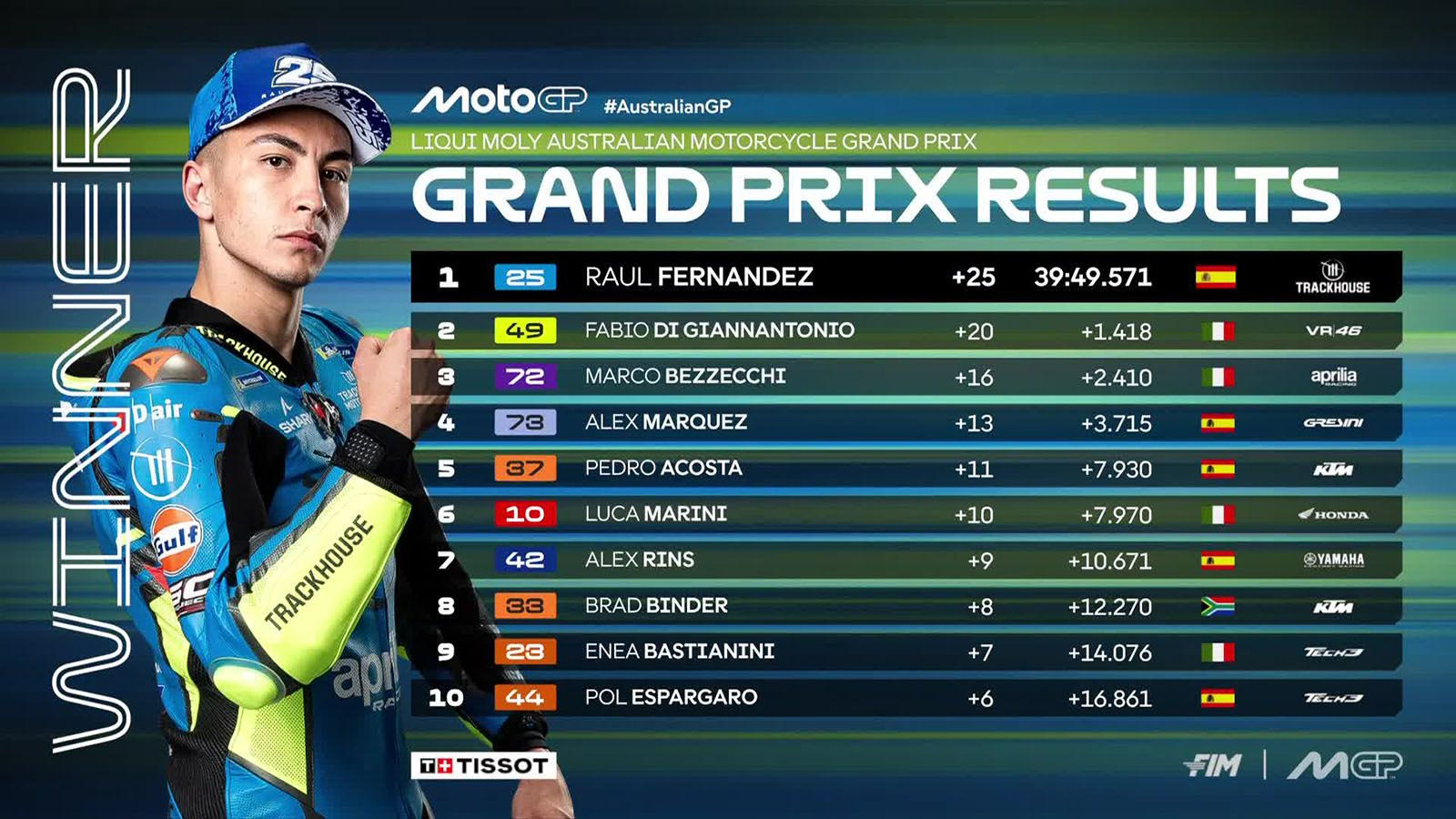 O Φερνάντεζ πήρε τα ηνία του αγώνα στον 6ο γύρο και δεν κοίταξε ποτέ πίσω, γράφοντας ιστορία ως ο πρώτος αναβάτης που κερδίζει αγώνα MotoGP με δορυφορική Aprilia – χαρίζοντας, παράλληλα, στην Trackhouse Racing την πρώτη της νίκη στο θεσμό.