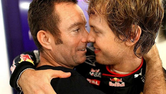 * Ο Κένι Χαντκάμερ αριστερά μαζί με τον Φέτελ σε πανηγυρικό στιγμιότυπο από τα χρόνια της κοινής τους παρουσίας στη Red Bull.