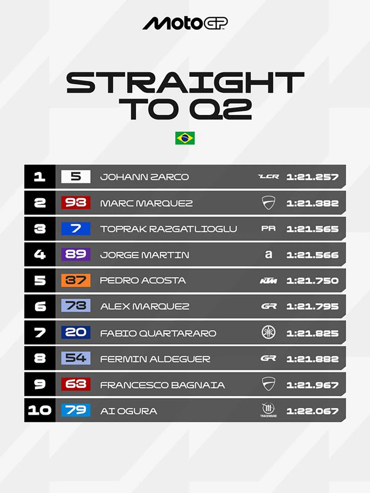Οι άστατες καιρικές συνθήκες στην πίστα της Γκοϊάνια έφεραν δύο εξαιρετικούς χρόνους από τον Ζοάν Ζαρκο της LCR Honda και τον Τοπράκ Ραζγκατλίογλου της Pramac Yamaha, αλλά και εκπλήξεις στα χρονομετρημένα δοκιμαστικά του MotoGP Βραζιλίας.