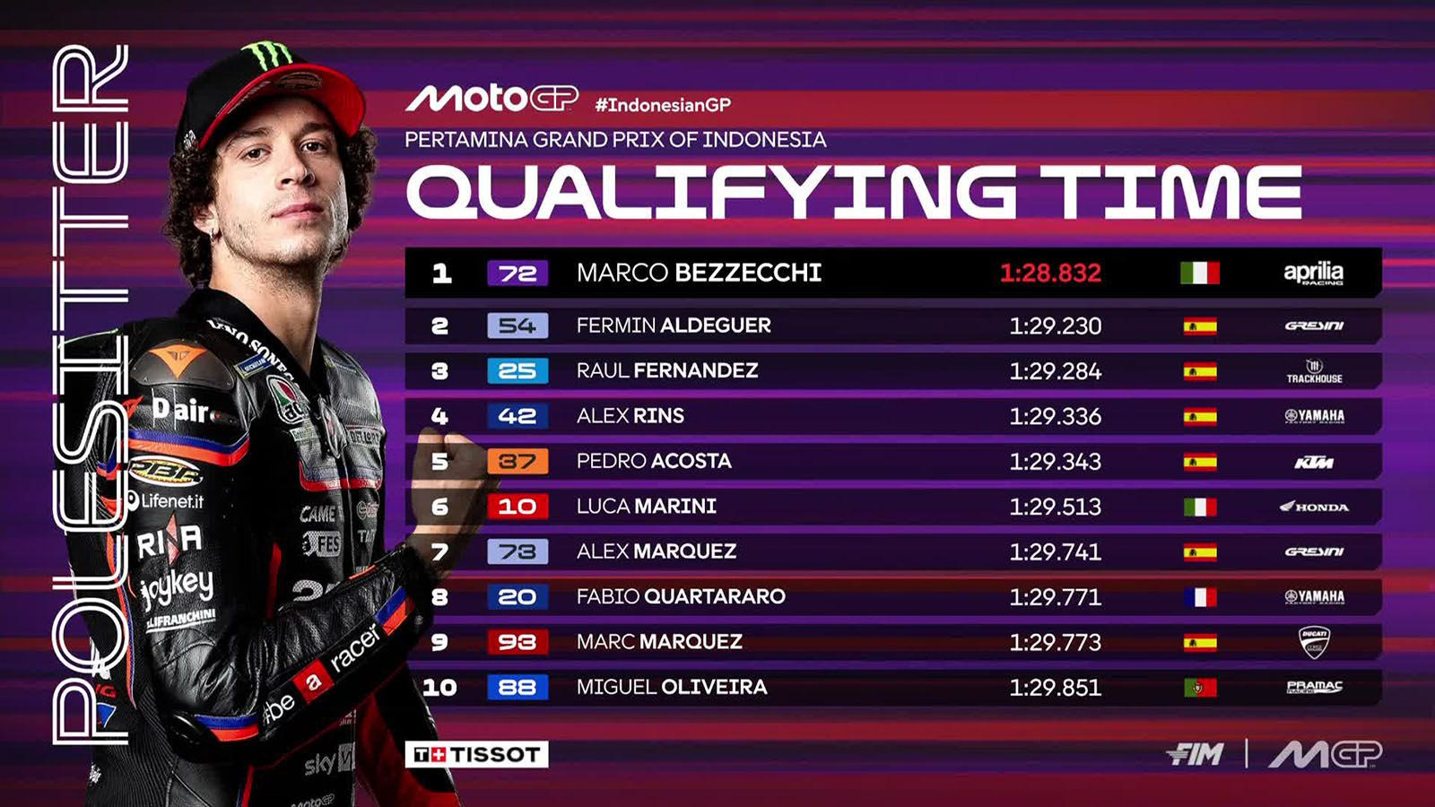 Ο Μάρκο Μπετζέκι διέλυσε με την Aprilia το ρεκόρ γύρου της πίστας της Ινδονησίας, για να κατακτήσει επιβλητικά την πολ ποζίσιον του 18ου φετινού αγώνα του MotoGP. Εντελώς απρόσμενη η σειρά εκκίνησης – οι Φερμίν Αλντεγκέρ και Ραούλ Φερνάντεζ στην πρώτη τριάδα, στην 9η και 16η θέση οι Μαρκ Μάρκεζ και Πέκο Μπανάια.