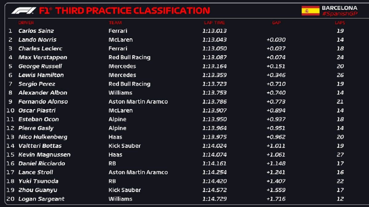 Ο Κάρλος Σάινθ ηγήθηκε με τη Ferrari SF-24 στην τρίτη περίοδο ελεύθερων δοκιμών του GP Ισπανίας, στα χιλιοστά του δευτερολέπτου από τις McLaren των Λάντο Νόρις και Red Bull του Μαξ Φερστάπεν και στο ενάμισι δέκατο από τη Mercedes του Τζορτζ Ράσελ.
