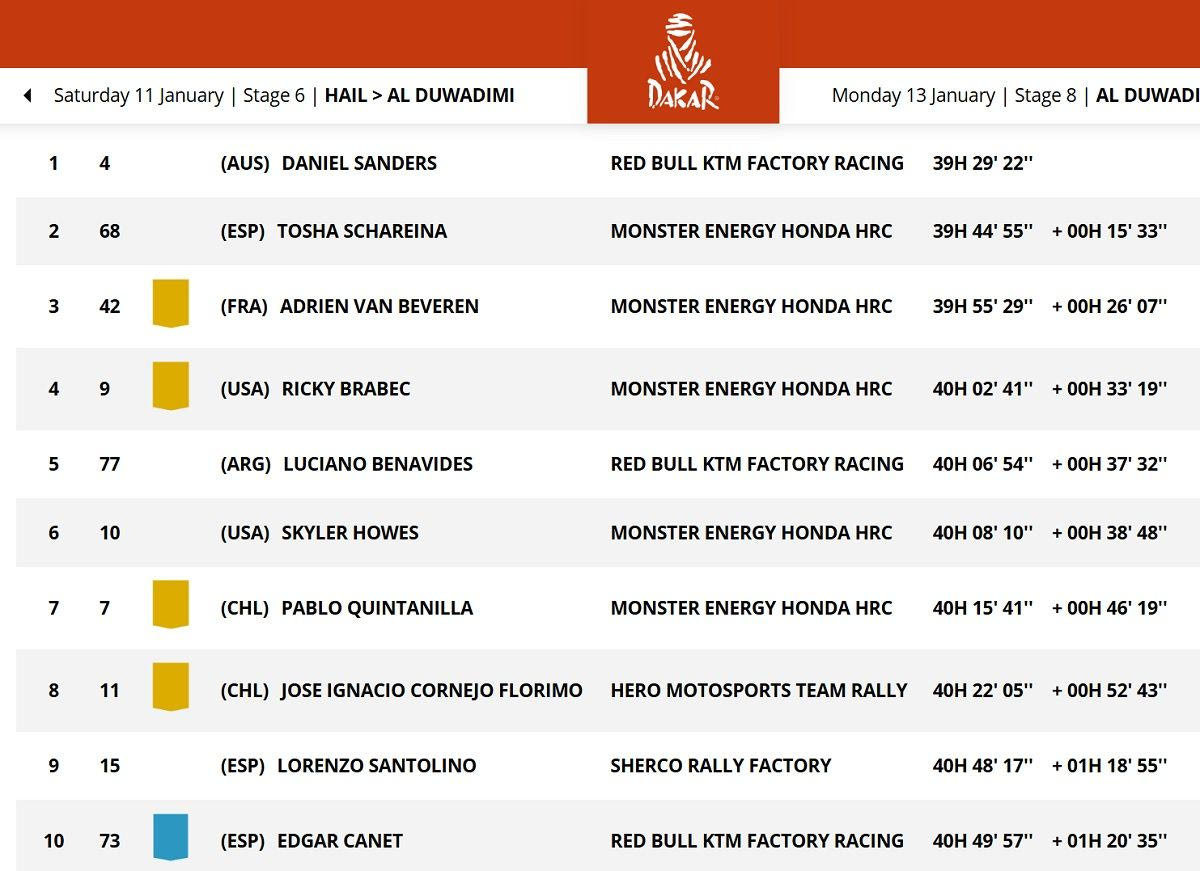 Την ίδια στιγμή, ο Ντάνιελ Σάντερς που εκκίνησε αργότερα έκανε μοναχικό αγώνα και παρότι έχει την πολυτέλεια να ακολουθήσει λίγο πιο συντηρητικό ρυθμό, κέρδισε στην Ειδική. Ήταν η 5η του φετινή νίκη Ειδικής Διαδρομής του Ράλι Ντακάρ (μαζί με τον ‘Πρόλογο)’, κάτι που τελευταίος είχε πετύχει ο Τόμπι Πράις το 2016.