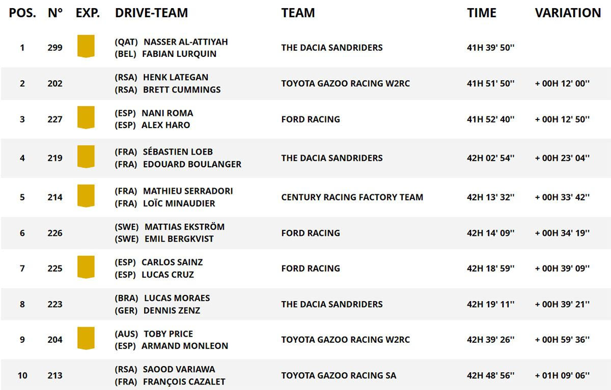 Ο Αλ-Ατίγια, παρά ποινή 40 δευτερολέπτων που δέχθηκε, κατάφερε να ολοκληρώσει την ΕΔ10 στη δεύτερη θέση. Ο ομόλογός του στη Dacia, Σεμπαστιάν Λεμπ, ξεπέρασε το πρόβλημα στο σύστημα υποβοήθησης του Sandrider του (που αναγκάστηκε να επισκευάσει μόνος του το βράδυ), τερματίζοντας τρίτος, εννέα λεπτά πίσω από την κορυφή.