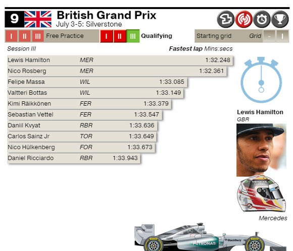 Οι Βρετανοί περίμεναν το δικό τους παιδί να ξεκινήσει από την pole position και εκείνος δεν τους απογοήτευσε. Ο Lewis Hamilton θα ξεκινήσει από την πρώτη γραμμή έχοντας δίπλα του τον Nico Rosberg. Ακριβώς πίσω τους οι δύο Williams των Massa και Bottas και τους ακολούθησαν οι Raikkonen και Vettel.