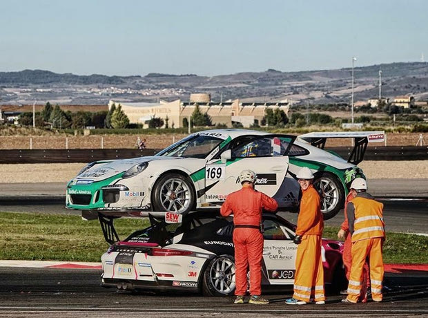 Συνέβη σε αγώνα του γαλλικού Πρωταθλήματος Porsche Carrera Cup στην πίστα της Navarra. Λίγες στροφές μετά την εκκίνηση, κάποιες Porsche 911 GT3 Cup στριμώχτηκαν τόσο που δύο από αυτές πρωταγωνίστησαν σε ένα ατύχημα που σπανίως βλέπουμε.