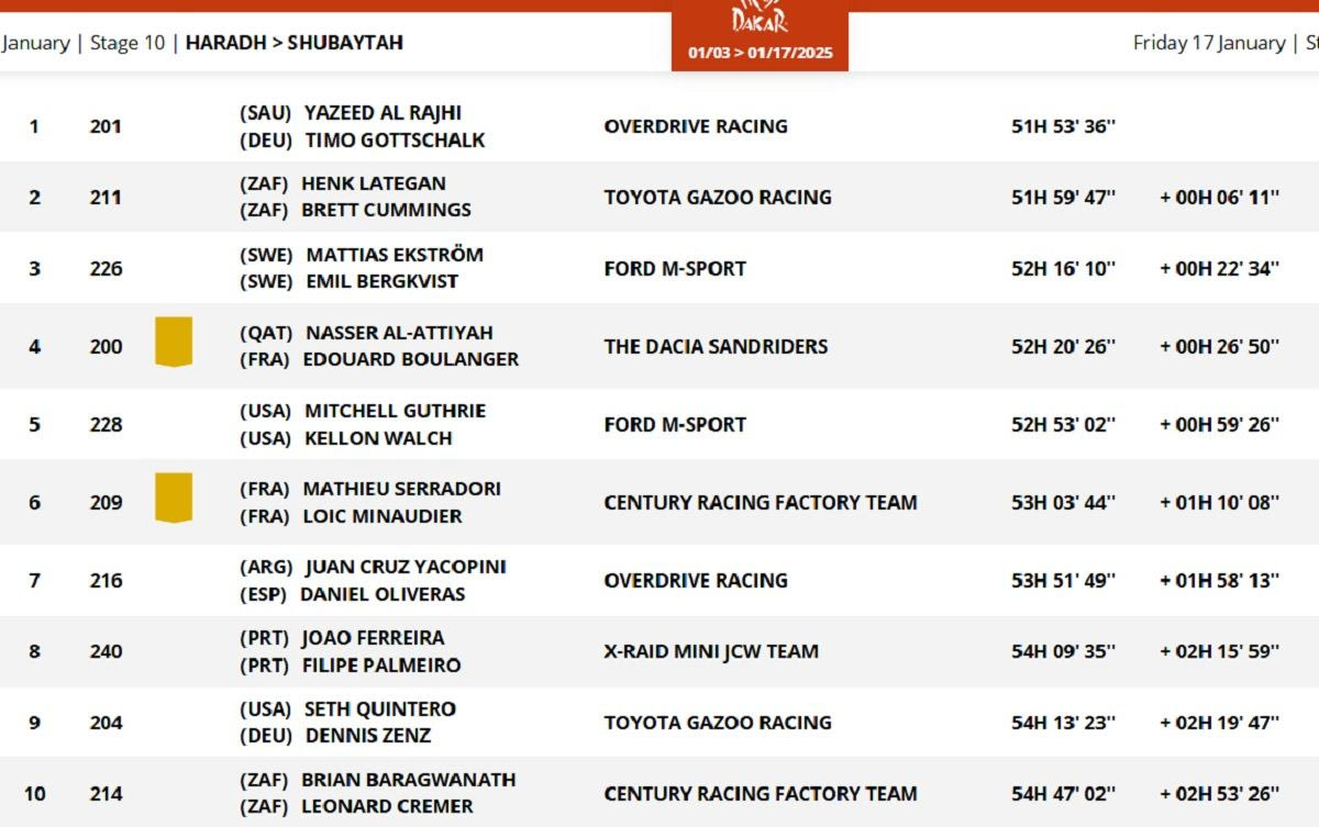 Η σημερινή προτελευταία δοκιμασία του Ράλι Ντακάρ 2025, η ΕΔ11 σε ένα loop 275 χιλιομέτρων γύρω από τη Σουμπαϊτάχ της Σαουδικής Αραβία και μέσα στην αχανή έρημο Empty Quarter, έφερε άλλη μια ανατροπή στη μάχη των αυτοκινήτων – καθώς ο Σαουδάραβας Γιαζίντ Αλ Ραζί τέθηκε ξανά επικεφαλής, κι ενώ απομένουν τα μόλις 61 αγωνιστικά χιλιόμετρα του αυριανού loop γύρω από τον ίδιο καταυλισμό για την ολοκλήρωση του αγώνα.