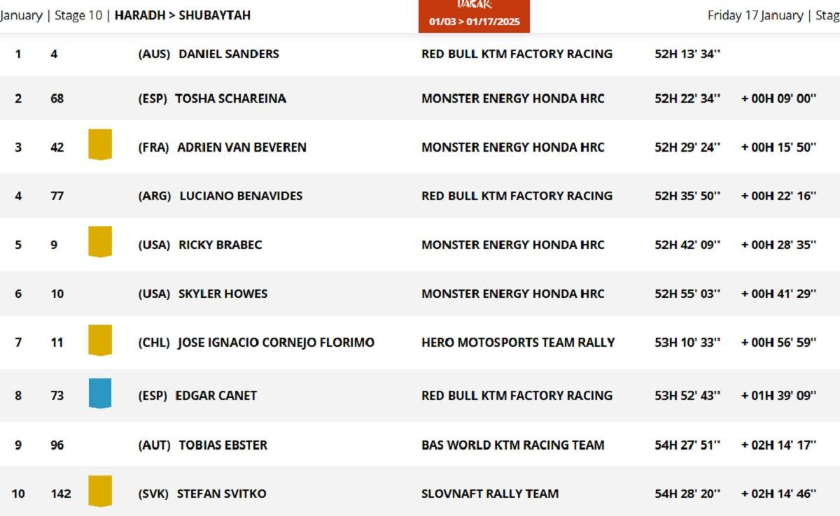 Ο Σαρέινα κέρδισε την Ειδική, και πήρε 7,5 λεπτά από τον Σάντερς, αλλά ο Αυστραλός με διαφορά 9 λεπτών από τον Ισπανό κρατά με το ένα χέρι το φετινό τρόπαιο με τον βεδουίνο, για την πρώτη νίκη της καριέρας του στο Ντακάρ.