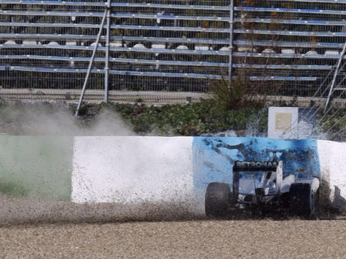 Ο Βρετανός οδηγός της Mercedes έκανε ποδαρικό στη νέα σεζόν, οδηγώντας το πρώτο μονοθέσιο στην πίστα. Είχε και το πρώτο ατύχημα της σεζόν (φωτό) όταν ξεκόλλησε η εμπρός αεροτομή της W05 της Mercedes.
