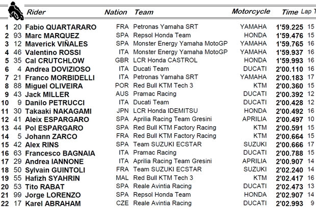 Ο Φάμπιο Κουαρταράρο ήταν εκείνος που τελικά έκανε τον ταχύτερο χρόνο με 1:59.225, επίδοση που αποτελεί και ρεκόρ γύρου για την πίστα. Ο Μάρκεθ έπεσε στη δεύτερη θέση με τον Μάβερικ Βινιάλες να παραμένει στην τρίτη. Αντίθετα, τέταρτος ανέβηκε ο Βαλεντίνο Ρόσι με 1:59.937. Ο τελευταίος που έκανε χρόνο κάτω από τα δύο λεπτά ήταν ο Καλ Κράτσλοου με 1:59.993.