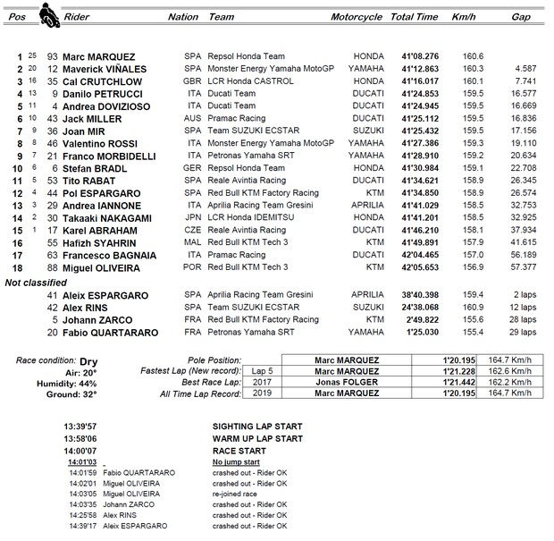 Τελικά, την κάρο σημαία είδε άνετα πρώτος ο Μαρκ Μάρκεθ και ακολούθησαν οι Βινιάλες και Κρατσλόου. Τέταρτος τερμάτισε ο Πετρούτσι και τον ακολούθησαν οι Ντοβιτσιόζο, Μίλερ, Ζοαν, Μιρ, Ρόσι, Μορνμπιντέλι και Μπρντλ.