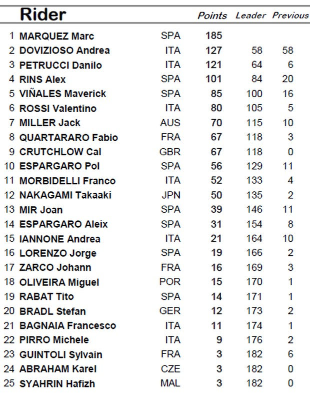 Το ίδιο σκηνικό συνεχίστηκε για μερικούς γύρους με τους Βινιάλες και Ρινς να προσπαθούν να μείνουν κοντρά στον Ισπανό, αλλά δεν κατάφεραν κάτι παραπάνω. Ο Ρινς κατάφερε να προσπεράσει τον Βινιάλες, όμως έκανε λάθος στον 20ο γύρο κι είχε την δεύτερη πτώση του μέσα σε μία εβδομάδα. Η μόνη μάχη που είδαμε ήταν αυτή ανάμεσα στους Μίλερ, Πετρούτσι και Ντοβιτσιόζο για την πέμπτη θέση, με τον δεύτερο να βγαίνει νικητής.