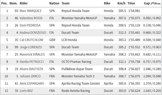Στη δεύτερη θέση θα βρίσκεται ο Valentino Rossi, ο οποίος ήταν εντυπωσιακός στις κατατακτήριες εν αντιθέσει με τις ελεύθερες δοκιμές, αφήνοντας τρίτο τον Dani Pedrosa. Από εκεί και πέρα, στη δεύτερη σειρά εκκίνησης θα βρίσκονται οι Andrea Dovizioso με Ducati, Cal Crutchlow με LCR Honda και Jorge Lorenzo -επίσης- με Ducati.