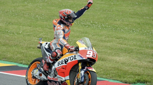 Moto GP rider Marc Marquez of Spain celebrates after winning the German Motorcycle Grand Prix at the Sachsenring circuit in Hohenstein-Ernstthal, Germany, Sunday, July 2, 2017. (AP Photo/Jens Meyer)